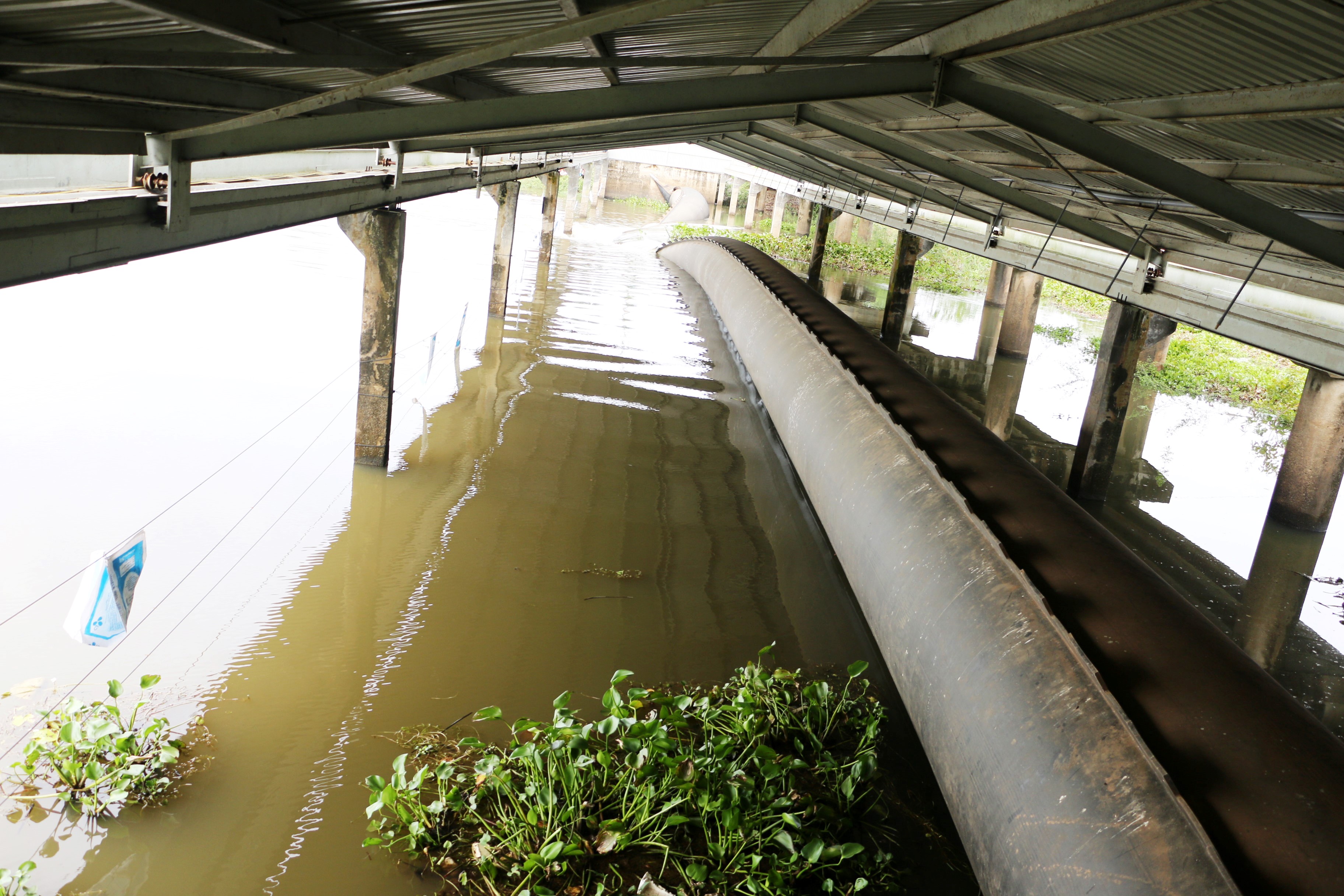 Hình 11: sáng ngày 22.09.2017 con đập tràn Tha La và đập tràn Trà Sư) của tỉnh An Giang được xả lũ sớm hơn một tháng nhằm đối phó với mưa lũ lên nhanh phía Cambodia thượng lưu so với cùng kỳ năm ngoái. Đường ống cao su chạy suốt chiều ngang đập tràn là “phao khí”. [nguồn: Tuổi Trẻ Online 22.09.2017]