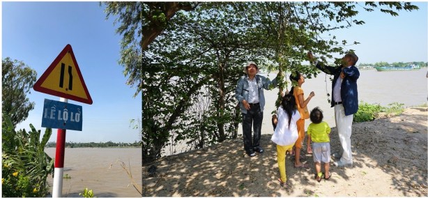 Hình 17: TS Dương Văn Ni và người viết đang giúp mấy cháu bé hồn nhiên hái trái cây trứng cá bên tả ngạn bờ Sông Hậu, nơi sát một khúc sông đang bị sạt lở. Cầu mong cho thế hệ các cháu vẫn còn được sống trong một môi trường xanh nhưng rồi ra, ai sẽ bảo vệ vùng trời quê hương rất đáng sống ấy cho các cháu. [photo by Phạm Phan Long]
