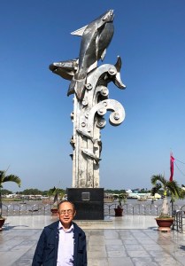 Hình 5: bên chân tượng đài cá Ba Sa, biểu tượng phát triển ngành thủy sản của Châu Đốc. Ba Sa là loại cá nuôi được ưa chuộng và đang bơi ra xa khắp thế giới. [photo by Nguyễn Hữu Thiện]