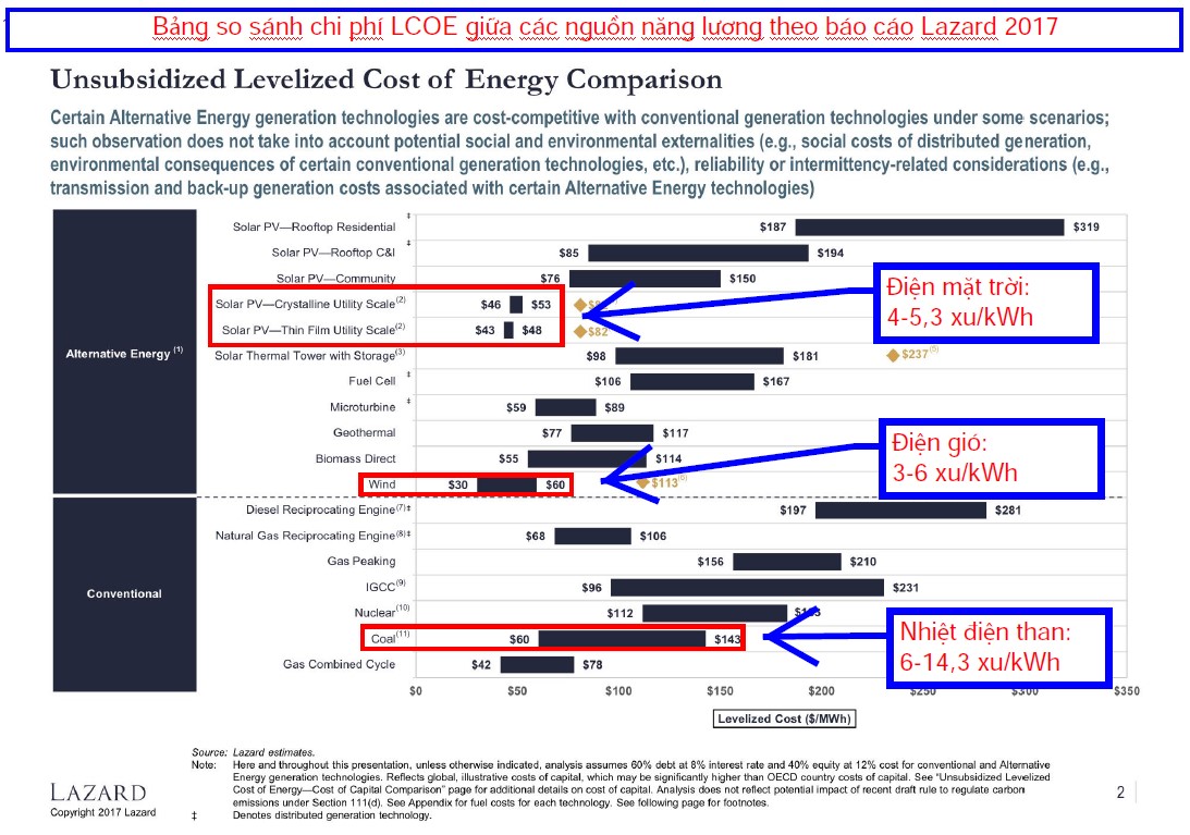 Theo báo cáo mới nhất vào tháng 11, 2017 của tổ chức có thẩm quyền Lazard [3], chi phí quy dẫn, Levelized Cost of Energy (LCOE) của nhiệt điện than 6 – 14,3 xu /kWh, LCOE cho điện mặt trời và điện gió chỉ 3 – 6 xu/kWh theo Bảng so sánh chi phí LCOE trích dẫn báo cáo của Lazard với chú giải tiếng Việt của người viết dưới đây. Chi phí quy dẫn, LCOE bao gồm chi phí đầu tư xây dựng, nhiên liệu, hoạt động và bảo trì.