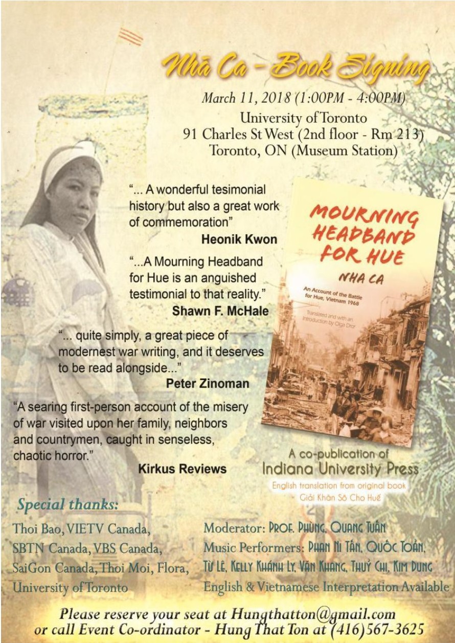 11/3/2018, Tôn Thất Hùng, hậu duệ của VNCH, người viết trẻ có chí hướng và tâm huyết, đã tổ chức một buổi ra mắt sách Giải Khăn Sô Cho Huế bằng tiếng Anh Mourning Headband For Hue tại Đại học Toronto với sự hiện diện của tác giả Nhã Ca và phu quân Trần Dạ Từ đến từ Hoa Kỳ.
