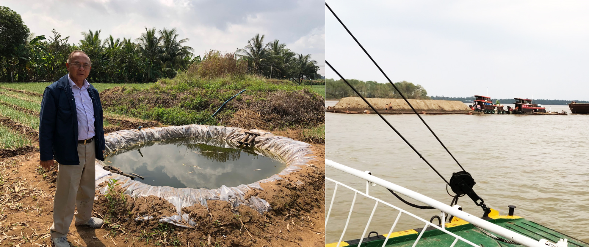 Hinh 7: trái, túi trữ nước ngọt lấy từ giếng bơm; 100% nước tưới ruộng hành, kể cả nước dùng cho tiện dụng gia cư đều lấy từ các giếng bơm từ các tầng nước ngầm, là nguyên nhân khiến nền đất ĐBSCL lún nhanh hơn mực nước biển dâng. [photo by Phạm Phan Long]; phải, cảnh vẫn thường thấy ngày đêm là những chuyến xà lan chở đầy cát được nạo vét từ hai con Sông Tiền và Sông Hậu, cũng là một trong những nguyên nhân gây sạt lở trầm trọng ven sông. [photo by Ngô Thế Vinh]