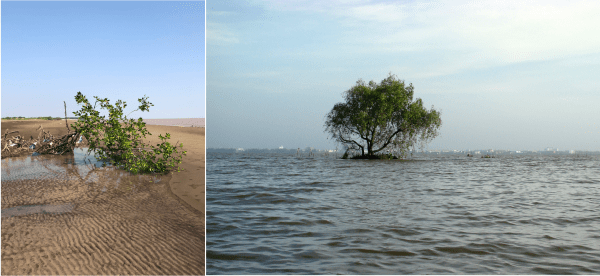Hinh 4: Dọc bờ biển ĐBSCL cũng ngày đêm âm thầm bị xói mòn / beach erosion; so với sạt lở ven sông, tình trạng sạt lở ven biển trầm trọng hơn nhiều. Một dãy nhà bị đổ sụp xuống sông được báo chí và dân chúng quan tâm nhiều hơn nhưng sạt lở ven biển là một cái chết chậm và rất âm thầm; hình trái, là cây bần bật gốc bị cuốn trôi rạt nơi Cửa sông Trần Đề. [photo by Ngô Thế Vinh 2017]; hình phải, sạt lở rừng ven biển gây mất đất đai tại huyện Phú Tân tỉnh Kiên Giang. [photo by PanNature VN 2012]