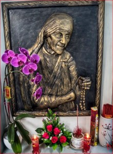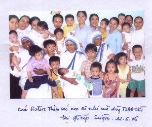 Mẹ Teresa đã thành thánh nhưng vết chân của mẹ ở nơi trần thế này vẫn còn rõ nét. Tôi tình cờ thấy trên Facebook một bức hình khắc trên đồng của mẹ Teresa đặt trước một bát nhang chi chít những chân nhang, bên cạnh một chiếc bình có những bó nhang dành cho người tới viếng thắp cho mẹ. Thấy bức hình lạ tôi chú ý đọc lời chú thích mới biết đây là một ban thờ kỷ niệm ngày mẹ tới thăm nơi này. Nơi đó có địa chỉ rõ ràng: 140/4 Võ Thị Sáu, phường 8, quận 3, Sài Gòn. Và ngày tấm hình được post lên là ngày 10/4/2018, ngày kỷ niệm tròn 24 năm mẹ Teresa đặt chân tới căn nhà này. Chuyện này làm tôi ngạc nhiên. Người mẹ của thế giới đã tới Việt Nam? Tôi liên lạc với người post hình là anh Soi Thomas để hỏi thêm chi tiết. Qua thư trả lời của anh tôi mới biết tháng 4/1994 mẹ Teresa có tới Việt Nam. Và mẹ đã đặt chân tới đất nước chúng ta năm lần tất cả! Anh kể chuyện cơ duyên gặp mẹ Teresa: “Vợ chồng chúng tôi theo thông lệ tham dự thánh lể song ngữ Việt – Pháp lúc 10 giờ sáng mỗi Chủ Nhật tại nhà thờ Đức Bà Sài Gòn. Ngay khi vừa dứt thánh lễ ngày Chủ Nhật, 10/4/1994 , linh mục chủ sự thánh lễ tên Vương đình Bích ( Bề trên dòng Anh Em Đức Mẹ Người Nghèo – AEDMNN– ) , ngài đã dành đôi phút để thông báo : Mẹ Teresa đang ở thành phố chúng ta, Mẹ có ý tìm một căn nhà trong khu vực bình dân để lập cộng đoàn của Mẹ , dòng Thừa Sai Bác Ái tại Việt Nam, bà con giáo dân có hoặc biết ai có nhà như vậy thì xin liên lạc với văn phòng nhà xứ nhà thờ Đức Bà để nói chuyện với Mẹ”. Anh Soi có căn nhà muốn dành cho mẹ Teresa nên liên lạc ngay với cha Bích sau khi tan lễ. Anh có được cái hẹn với mẹ Teresa và các sơ trong đoàn. “Đúng 15 giờ rưỡi , tôi và bà xã Yoshii Michiko vào căn nhà ở Bà Huyện Thanh Quan , căn nhà không phải là khách sạn mà dạng như nhà có phòng cho thuê , người tiếp tân chào, nhận ý kiến của chúng tôi xong gọi điện thoại nội bộ báo có chúng tôi đã đến. Đôi phút sau từ trên cầu thang xoắn bằng sắt, Mẹ Teresa vịn tay vào thành cầu thang từ từ chậm chậm bước xuống , một phụ nữ lớn tuổi dáng người thấp nhỏ trong tu phục sari xuất hiện đi theo là một nữ tu cùng dòng , một phụ nữ khác nữa mập mập trong y phục đời thường cùng xuống cầu thang theo Mẹ. Sau khi đón nhận đôi tay nồng ấm và nụ cười hiền dịu của Mẹ , lòng cảm thấy toại nguyện , không ngờ được diện Mẹ mà gặp trong tâm thế như gặp một người thân mà lòng kính trọng từ lâu”.