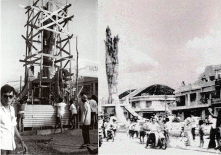 Hình 2: trái, Tượng đài Bông Lúa Con Gái 1970 bằng đồng lá, một tác phẩm nghệ thuật lớn của điêu khắc gia Mai Chửng; [tài liệu Hội Hoạ Sĩ Trẻ 1966-1975]; phải, Mai Chửng đang dựng tượng đài Bông Lúa ở Long Xuyên. [tư liệu Huỳnh Hữu Uỷ]