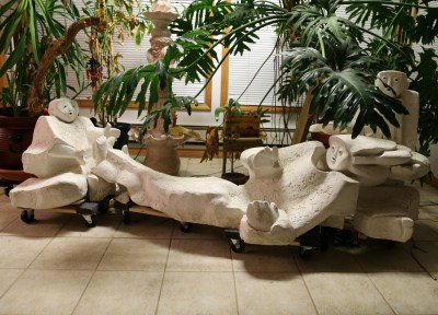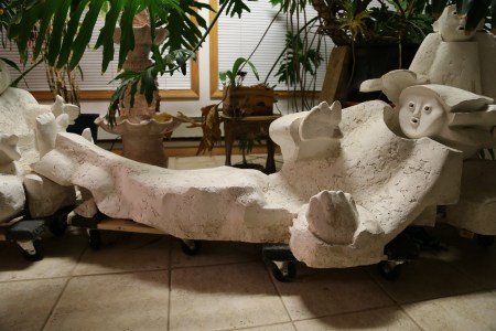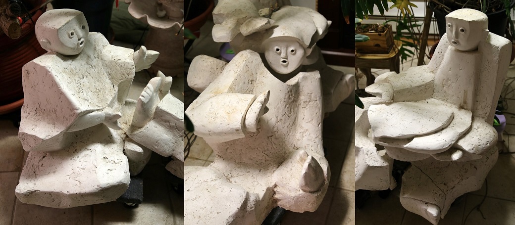 Hình 6: Hình chụp từng phần bức tượng Mẹ và Con của Mai Chửng; từ trái hình con dưới chân mẹ 24″x25″x18″; hình mẹ 49″x30″x18″; hình con nơi đầu mẹ 30″x30″x20″. [photo by Nguyễn Văn 20.05.2018, tư liệu Ngô Thế Vinh]