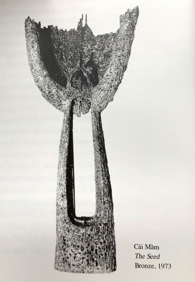 Hình 4: Tượng Mầm cao 1.50 m, chất liệu bằng đồng làm bằng cả ngàn vỏ đạn hàn lại, được Mai Chửng cho triển lãm năm 1974 tại gallery La Dolce Vita trong khách sạn Continental nổi tiếng trên đường Tự Do Sài Gòn. Sau 1975, bức tượng Mầm ấy đã bị vứt vào nhà chứa củi, hay một xó xỉnh chứa đồ phế thải nào đó, và nay số phận bức tượng ấy ra sao thì không ai được biết. [tư liệu gia đình Mai Chửng]