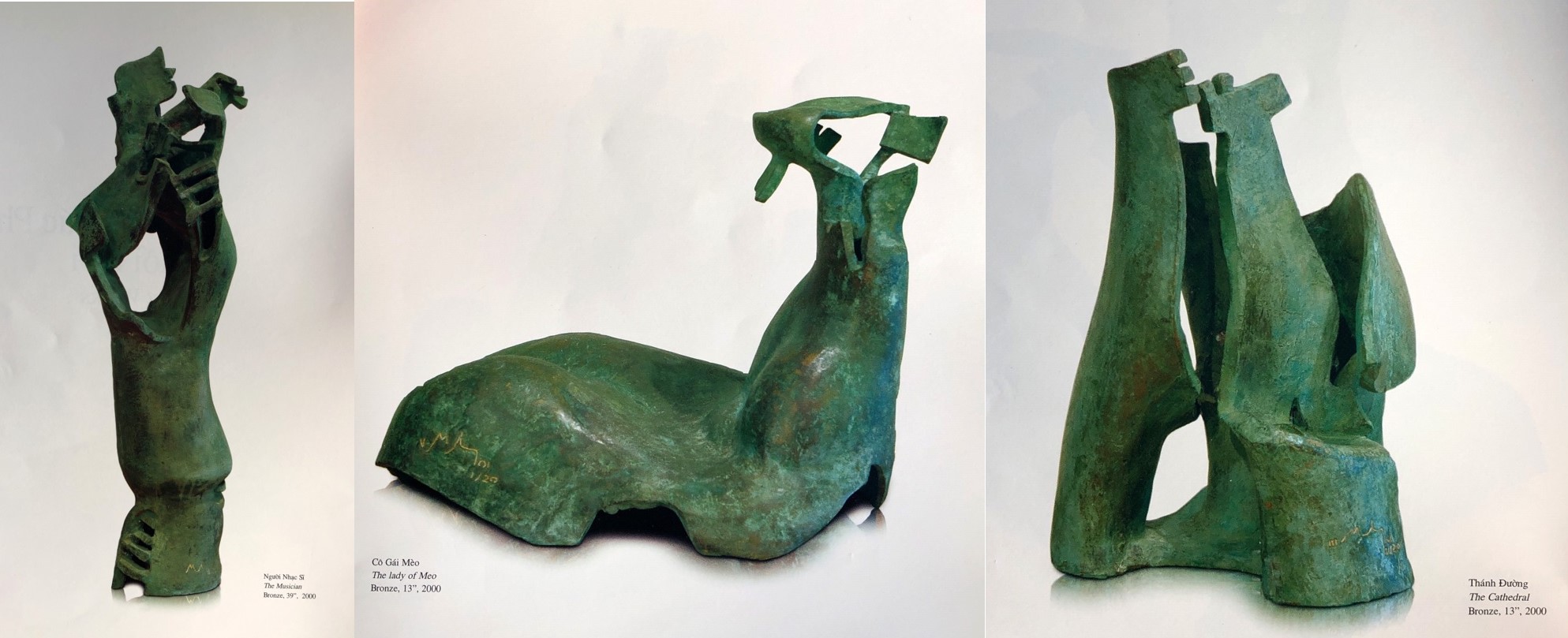 Hình 9a: từ trái, (1) Người Nhạc Sĩ, 2000, Bronze 39”; (2) Cô Gái Mèo, 2000, Bronze 13”; (3) ‘Thánh Đường, 2000, Bronze 13”