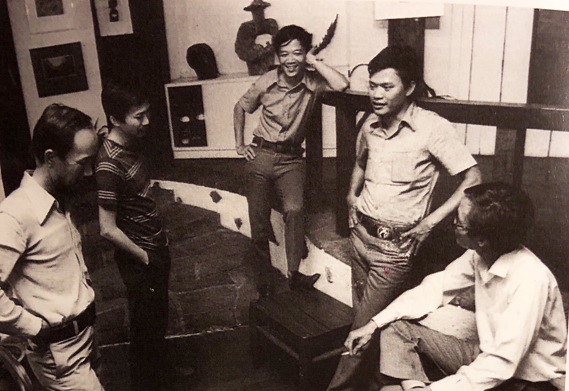 Hình 11: Sinh hoạt Hội Hoạ Sĩ Trẻ Việt Nam; từ trái: Trịnh Cung, Nguyễn Trung, Nghiêu Đề, Mai Chửng, Hồ Thành Đức. [tư liệu Hội Hoạ Sĩ Trẻ Việt Nam]