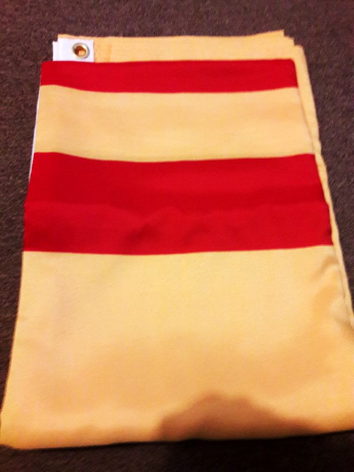 Hình 9: trái, lá quốc kỳ VNCH lớn 21 feet; phải:chiếc bình nhựa 5 gallons xăng để sau cốp xe trên đường tới Tượng đài Chiến sĩ Việt Mỹ, trên đường All American Way, ngày 20.06.2018, Westminster.