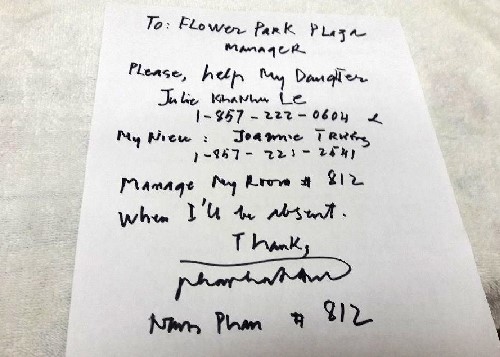 Hình 11: trái, một đoạn thơ của Phan Nhật Nam trong Đêm Tận Thất Thanh (1997); phải: mấy dòng di bút dặn dò người quản lý chung cư Flower Park Plaza, # 812 là số phòng của Phan Nhật Nam. Cũng Chung cư này, trên lầu 10 là nơi nhà thơ Nguyễn Chí Thiện sống những ngày tháng cuối đời. [tư liệu Ngô Thế Vinh]