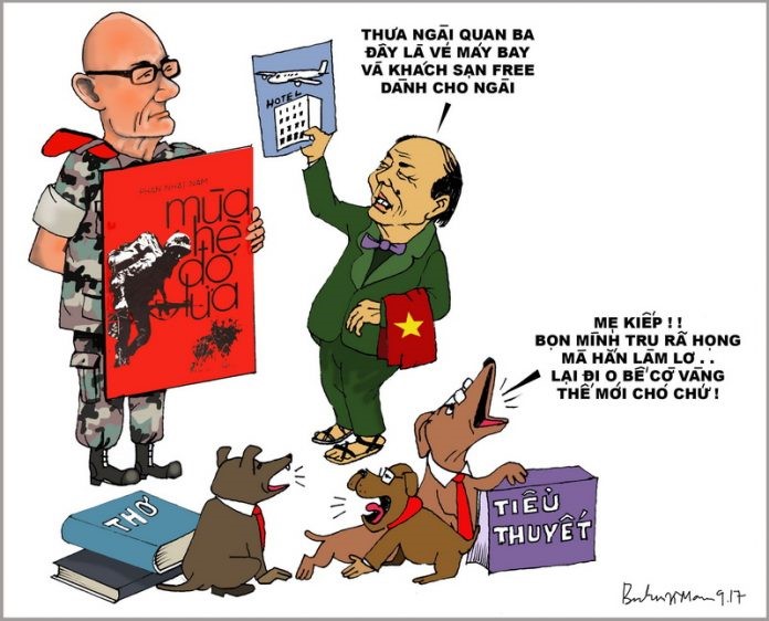 Hình 8: tranh hí hoạ của Babui Mamburao 9/2017 nhân sự kiện Chủ tịch Hội Nhà Văn Việt Nam Hữu Thỉnh mời nhà văn Phan Nhật Nam, tác giả Mùa Hè Đỏ Lửa về tham dự cuộc họp mặt ở Hà Nội và một số địa phương miền Bắc từ ngày 20 đến 25 tháng 10 năm 2017. [nguồn: Đàn Chim Việt]