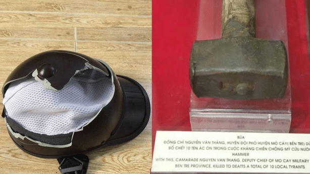 Cây búa dưới đây được chụp ở Bảo tàng Quân đội Việt Nam. Phía dưới kỉ vật có ghi như sau: ‘BÚA. Đồng chí Nguyễn Văn Thắng, huyện đội phó huyện Mỏ Cày (Bến Tre) dùng bổ chết 10 tên ác ôn trong cuộc kháng chiến chống Mỹ cứu nước’. Ngoài ra, còn có dòng chữ tiếng Anh: ‘HAMMER. WITH THIS, CAMARADE NGUYEN VAN THANG, DEPUTY CHIEF OF MO CAY MILITARY DISTRIS, BEN TRE PROVINCE, KILLED TO DEATTS A TOTAL OF 10 LOCAL TYRANTS.’ (Chú ý phiên bản tiếng Anh sai văn phạm và ngữ vựng rất nhiều, nhưng không có nói đến “Chống Mỹ cứu nước”). Có lẽ không cần nói gì thêm, đây là một chứng từ về tội lỗi trong chiến tranh.