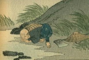 Khi lão đến dòng suối, lão không thấy bà đâu. Lão vừa dợm bước tính về thì lão nghe thấy tiếng o oe từ đám cỏ lau gần suối. Lão tìm kiếm và thấy quần áo của vợ mình cùng với một đứa bé; đúng ra là một hài nhi khoảng 6 tháng tuổi.