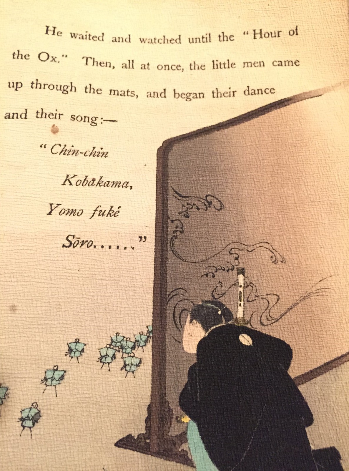 Chúng nhìn thật kỳ dị và nhảy múa khôi hài đến nỗi tướng quân khó nhịn được cười. Rồi ông thấy khuôn mặt hãi hùng của vợ; ông cũng nhớ ra hầu hết ma quỉ Nhật bản đều sợ gươm. Ông bèn rút gươm, nhảy xổ ra và bắt đầu chém đám vũ công tí hon. Lập tức chúng biến thành thứ gì – các bạn biết không? Tăm xỉa răng!