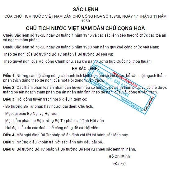 “Ngày 17-11-1950, Hồ Chí Minh ký Sắc lệnh số 158-SL, quyết định việc bổ sung cán bộ công nông vào ngạch thẩm phán và thăng bổ các thẩm phán toà án nhân dân huyện lên toà án nhân dân tỉnh…Từ đây, theo ông Vũ Đình Hòe: ‘các thẩm phán huyện, đa số là đảng viên cộng sản, chỉ qua lớp chính trị và nghiệp vụ’. Quan điểm lựa chọn thẩm phán chủ yếu ‘đứng trên lập trường nhân dân’ của Hồ Chí Minh đã ảnh hưởng lâu dài đến nền tư pháp Việt Nam.” (Huy Đức. Bên Thắng Cuộc, tập II. OsinBook, USA: 2012).