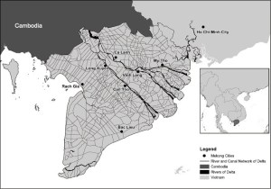 Hình 2: Bản đồ hệ thống sông và kênh rạch chằng chịt nơi vùng châu thổ Đồng Bằng Sông Cửu Long [Nguồn: Amir Hosseinpour (ZEF), trích dẫn bởi Simon,2014] (6)