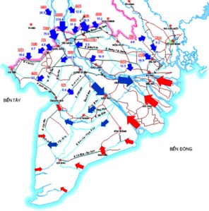 Hình 11: Sơ đồ dự án hệ thống cống đập chắn mặn trên Sông Cái Lớn- Sông Cái Bé, sẽ tác động trên 1/4 diện tích toàn ĐBSCL và ảnh hưởng tới đời sống hàng triệu cư dân trong vùng. [nguồn: Ánh Sáng và Cuộc Sống]
