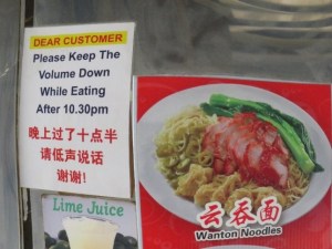 Chính xác hơn là đêm qua, sau một chuyến xe đò đường dài – từ Kuala Lumpur đến Singapore – tôi mệt rã rời nên lấy phòng khách sạn xong là lăn ra ngủ say như chết. Mở mắt dậy thì đã khuya, bụng đói, tôi lò dò vào một tiệm ăn đèn đuốc vẫn còn sáng trưng. Vừa ngồi xuống ghế, đã thấy ngay bên cạnh mình là hình một tô hoành thánh mì, cùng dòng chữ song ngữ (Please Keep The Volume Down While Eating After 10:30 PM) dán ngay trên tường.