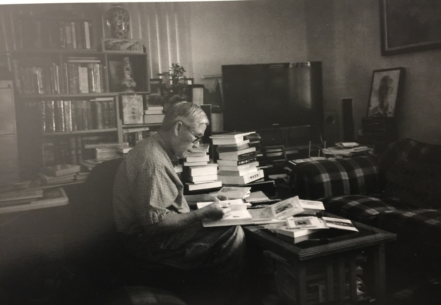 Nhà anh là một thư viện. Đó là nói về số lượng sách. Nhưng cam đoan không có cái thư viện nào bề bộn như vậy. Trong căn nhà nhỏ, sách lấn người. Phòng khách của anh tứ bề là sách. Vài chiếc kệ sách èo uột, khặc khè ôm sách, đứng sát vách tường như e dè với từng chồng sách chênh vênh trên bàn, trên ghế. Trong các phòng khác, sách cũng chiếm thế thượng phong. Ngoài hành lang, sách cũng lủ khủ trong những thùng giấy mà những khi mưa gió, anh phải di chuyển để sách khỏi ướt. Nhà chỉ có hai vợ chồng nhưng sách của anh coi bộ làm bá chủ. Chị nói nhỏ với tôi: “Chi chứ sách của anh là không bao giờ được đụng tới!”. Sách được thể lên chân lên cẳng.