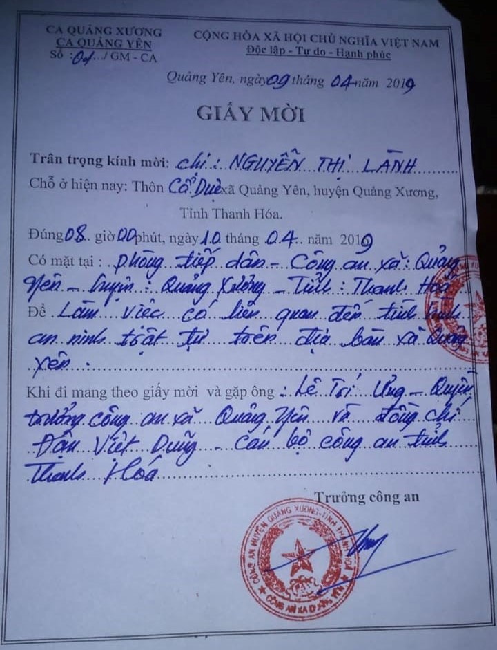 Không chỉ thường xuyên xua quân đi canh cửa, an ninh Thanh Hóa còn liên tục gửi giấy mời, giấy triệu tập như là một thủ trấn áp tinh thần bà Nguyễn Thị Lành – vợ của Mục sư, TNLT Nguyễn Trung Tôn.