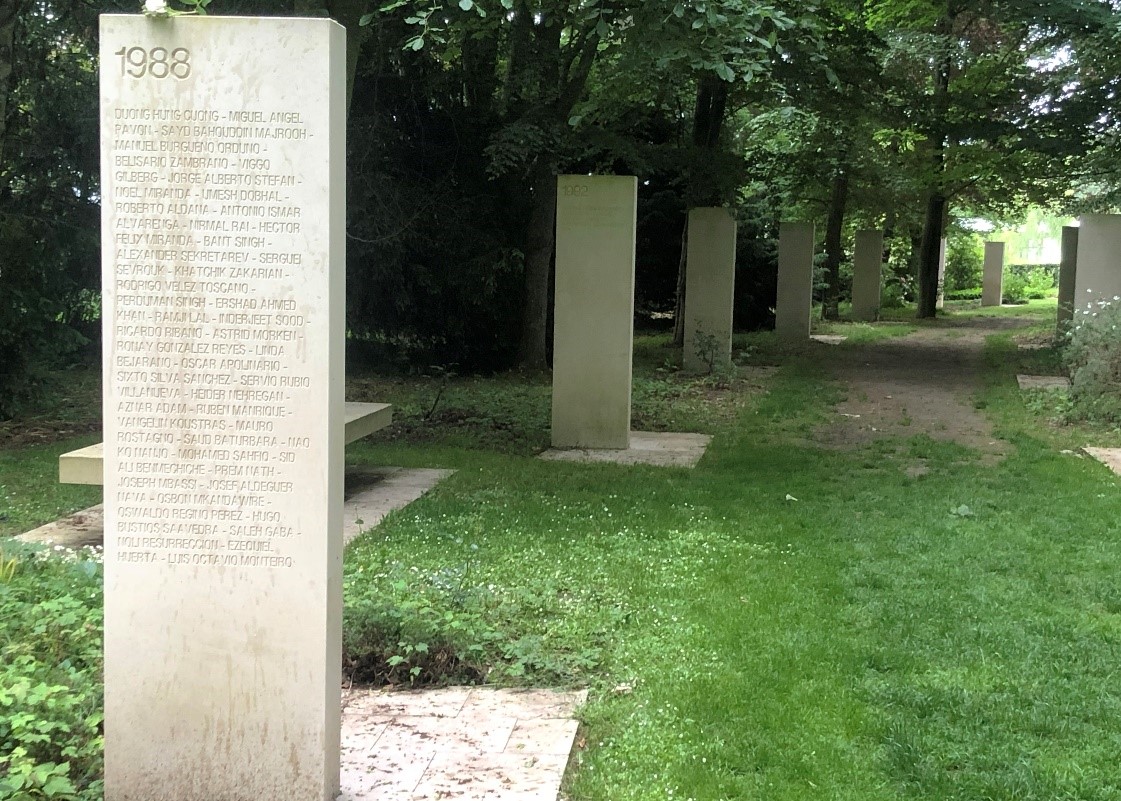 Khu vườn tưởng niệm gồm 27 bia đá khắc tên gần 2.500 phóng viên khắp thế giới đã hy sinh từ năm 1944 đến nay. Hy sinh vì sứ mạng đưa tin của họ. Ảnh: HĐT