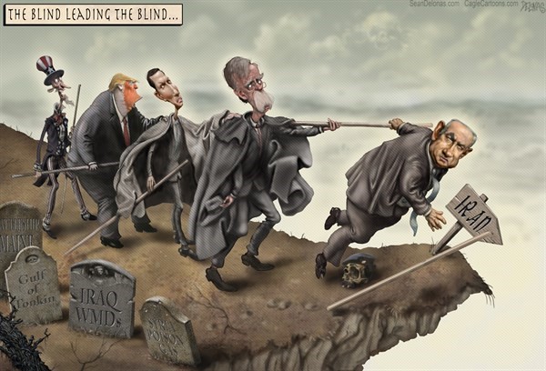 Từ hàng chục (và sau đó tăng lên đến cả trăm, đếm không xuể) tranh phản đối của thế giới tự do về phản ứng của NYT từ bỏ tranh biếm họa, chưa kể những bài viết; mới đây ở Mỹ vẫn xuất hiện đề tài cổ điển, muôn đời trong chính trường Mỹ, jhông thể tránh khỏi, ảnh hưởng đến chính trị thế giới, trực tiếp hay gián tiếp: Thủ tướng Netanyahu như người mù, dẫn đường Bộ tham mưu của TT Trump gồm Cố vấn An ninh John Bolton, con rể Jared Kushner, Cố vấn cao cấp của TT và sau Trump là Uncle Sam, đại diện cho dân Mỹ… sắp sửa bước xuống vực vì “chiến tranh” với Iran.