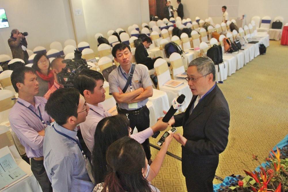 Hình 6: Tại Diễn đàn Khu vực liên quan tới Dự án thủy điện Pak Beng – con đập dòng chính thứ ba của Lào, họp tại Luang Prabang ngày 22.2.2017, các nhà báo đang phỏng vấn TS Phạm Tuấn Phan, Giám đốc Điều hành Ban Thư ký Uỷ hội sông Mekong. Khi trao đổi với phóng viên Lê Quỳnh, báo Người Đô Thị (người đang cầm máy ghi âm), ông Phạm Tuấn Phan đã mạnh mẽ phát biểu: “Thủy điện không khiến dòng sông Mekong sẽ chết. Tôi nghĩ chúng ta nên hiểu rõ điều này trước đã.” Chắc chắn ông Phạm Tuấn Phan sẽ không nói câu đó nếu ông hiểu thế nào là “Dòng chảy Môi trường / Environmental Flow” để giữ cho con sông Mekong không chết. [Photo by Thiện Ý].