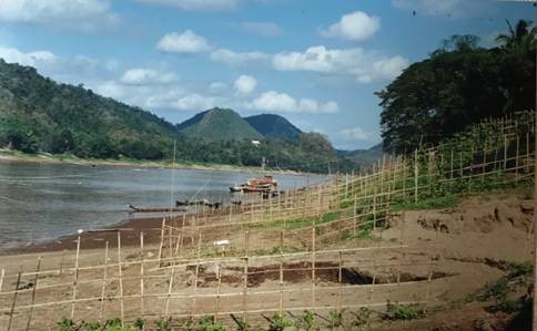 Khu vực dự kiến xây đập Luang Prabang 1410 MW trên dòng chính sông Mekong, phía bắc con đập Xayaburi, chỉ cách thị trấn Luang Prabang 25 km; hình chụp khúc sông Mekong chảy qua địa phận cố đô Luang Prabang, đã được UNESCO công nhận là Khu Di sản Thế giới / World Heritage Site từ 1995, vốn được ca ngợi như một trong những thành phố cổ đẹp nhất Đông Nam Á thì nay Luang Prabang đang bị thương mại hóa và cả Hán hóa. Canh tác ven sông với nguồn phù sa sông Mekong là một phần nông nghiệp gia đình truyền thống của người dân Lào. Nguồn: photo 2000 by Ngô Thế Vinh