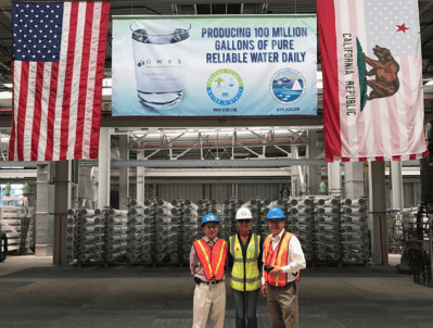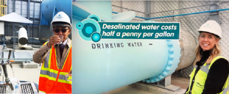 Hình 1: TỪ NGUỒN NƯỚC BIỂN. Poseidon Water / Carlsbad Desalination Plant, nhà máy khử mặn từ nguồn nước biển qua kỹ thuật thẩm thấu đảo nghịch / reverse osmosis mỗi ngày sản xuất / cung cấp 50 triệu gallons nước/ ngày (190,000 mét khối), là nguồn nước uống tinh khiết cho 400,000 ngàn cư dân Quận San Diego. Nhóm Bạn Cửu Long đi thăm khu nhà máy khử mặn Carlsbad lớn nhất nước Mỹ; từ phải: Ngô Thế Vinh, Jessica H. Jones Director of Communications, Phạm Phan Long. [photo by Ngô Minh Triết] (1)