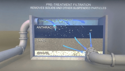 Hình 4: Jessica H. Jones giải thích: nước biển được bơm vào nhà máy; trước hết phải qua giai đoạn gạn lọc các tạp chất và những hạt lơ lửng – suspended particles qua các tầng đá vụn, cát và tầng than đá cứng anthracite – hard coal, trước khi bước sang giai đoạn 2 thanh lọc khử mặn. (1,2)
