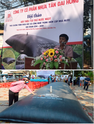 Hình 8: Trước nạn ngập mặn nặng toàn tỉnh Bến Tre, sáng 10.01.2020 một buổi hội thảo giới thiệu túi trữ nước ngọt (có sức chứa từ 1 tới 100 mét khối) theo Chương trình Khoa Học & Công Nghệ Cấp Nhà Nước [sic] do công ty nhựa Tân Đại Hưng sản xuất [trên, SGGP Online 11.01.2020]. Người dân Bến Tre có dịp tìm hiểu thêm “giải pháp hữu hiệu” để ứng phó với tình trạng hạn mặn địa phương [dưới: báo điện tử Bộ TN & MT 12.01.2020].