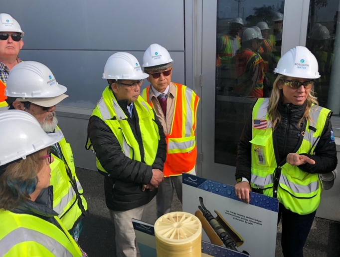 Hình 1: TỪ NGUỒN NƯỚC BIỂN. Poseidon Water / Carlsbad Desalination Plant, nhà máy khử mặn từ nguồn nước biển qua kỹ thuật thẩm thấu đảo nghịch / reverse osmosis mỗi ngày sản xuất / cung cấp 50 triệu gallons nước/ ngày (190,000 mét khối), là nguồn nước uống tinh khiết cho 400,000 ngàn cư dân Quận San Diego. Nhóm Bạn Cửu Long đi thăm khu nhà máy khử mặn Carlsbad lớn nhất nước Mỹ; từ phải: Ngô Thế Vinh, Jessica H. Jones Director of Communications, Phạm Phan Long. [photo by Ngô Minh Triết] (1)