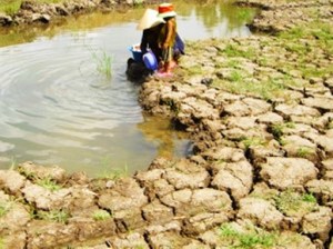Hình 6: ĐBSCL với những cánh đồng bị khô nứt – sa mạc hoá / desertification, do trận hạn hán khốc liệt năm 2016. (trên) [VN Express 3/11/2016]; Dự báo Mekong: trận hạn hán và nhiễm mặn 2020 sẽ trầm trọng hơn năm 2016. Mekong Delta barbecue / ĐBSCL bị nướng do khô hạn. (dưới) [tranh biếm hoạ của Babui, tặng Ngô Thế Vinh]
