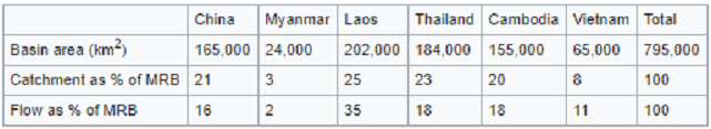Theo Báo cáo Thủy văn [1] của Mekong River Commission, trung bình mỗi năm các lưu vực góp phần vào dòng chảy theo bảng tỉ lệ sau, Trung Quốc 16%, Lào 35%, Thái Lan Cam Bốt đều 18%, Việt Nam 11% và Miến 2%. Do đó, Việt Nam không phải vô can vì cũng xây nhiều thủy điện trên phụ lưu tại Việt Nam, nhưng đứng thứ năm trong sáu nước, không có nhiều nước để cất giữ gây ra đại hạn như hiện nay.