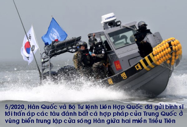 Nhìn tấm hình vào đầu tháng 5/2020, Hàn Quốc và Bộ Tư Lệnh Liên Hiệp Quốc đã gửi binh sĩ tới trấn áp các tàu đánh bất cá hợp pháp của Trung Cộng ở vùng biển trung lập cửa sông Hàn giữa hai miền Triều Tiên.