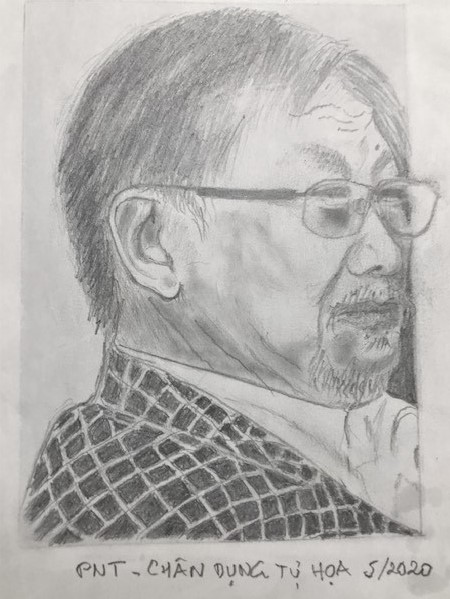 Bây giờ ở tuổi về chiều, tôi lại ngứa tay xách cây đờn ra đờn tửng tửng tưng, rút cây viết chì ra quệt quạc cái bổn lai diện mục mình, dù chẳng ra hồn cũng để cho vui với quãng đời còn lại nơi đất khách quê người. Vì không có đồ nghề vẽ cho ra nghề nên tôi lấy đại cây viết chì xì cút lụi hụi dợt lại vài “đường gươm”: tôi tự vẽ mình.