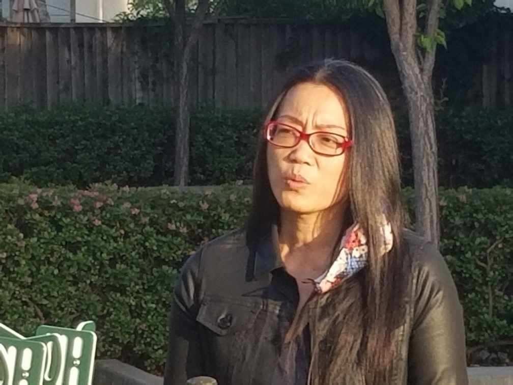 Người phụ nữ tên Trinh đang trả lời phỏng vấn của đài truyền hình KABC-TV.