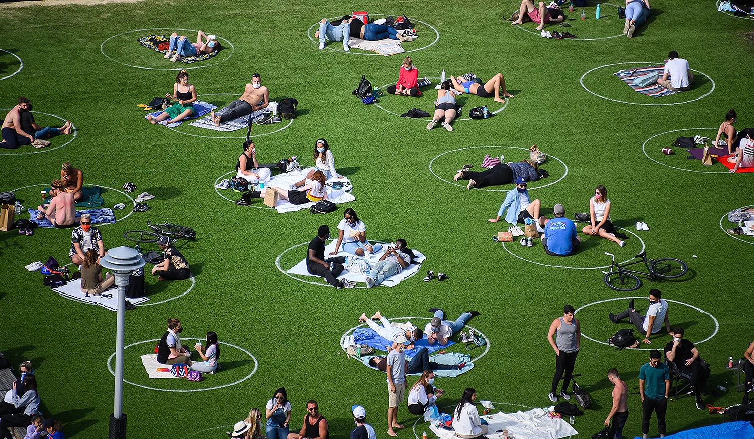 Mỗi vòng tròn có đường kính 10 feet, cách nhau 8 feet được vẽ bằng một loại sơn trắng đặc biệt trên cỏ xanh nhắc nhở mọi người giữ khoảng cách ít nhất là 6 feet. Mỗi gia đình, mỗi nhóm người chỉ được sử dụng một vòng tròn vào ngày lễ Memorial Day, mở đầu mùa hè ở Mỹ.