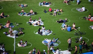 Những vòng tròn trắng nổi bật trên bãi cỏ non xanh tươi giúp hạn chế dịch bệnh lây lan, cũng nhắc nhở trách nhiệm của mỗi cá nhân, mỗi gia đình nhớ bổn phận mình tôn trọng an toàn nơi công cộng.
