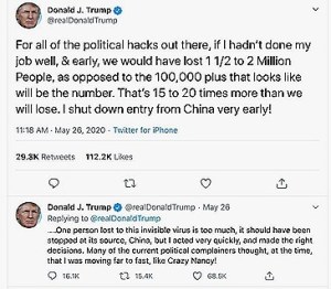 Hơn hai tháng sau, và một ngày trước khi Mỹ đạt con số 100,000 người thiệt mạng vì đại dịch, hôm 26 tháng 5, TT Trump viết trên tweet của ông: “Cùng tất cả bọn “đâm thuê chém mướn chính trị” ngoài kia, nếu tôi đã không làm nhiệm vụ tốt và sớm, chúng ta đã thiệt hại một triệu rưỡi tới hai triệu người, thay vì hơn 100,000 như con số có vẻ sắp tới. Đó là 15 đến 20 lần nhiều hơn chúng ta đã mất. Tôi đã đóng cửa nhập khẩu từ Tàu rất sớm.”