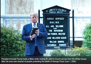 Tổng Thống Trump cầm một cuốn Thánh Kinh bên ngoài St. John’s Church (nhà thờ Anh giáo) phía trước Bạch Ốc, ngày 1 tháng 6, 2020, sau khi đám biểu tình phản đối cái chết của George Floyd đã bị cảnh sát dùng hơi cay giải tán.