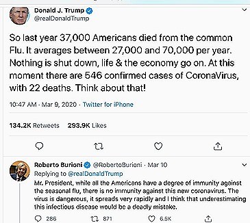 Tweet dưới, một người tên là Roberto Burioni, trả lời TT Trump vào ngày hôm sau, 10 tháng 3: Thưa Tổng Thống, tất cả người Mỹ đều có độ miễn dịch chống cúm mùa, trong khi không có miễn dịch chống lại coronavirus mới này. Thứ virus này nguy hiểm, nó lan toả rất nhanh và tôi nghĩ rằng coi thường thứ bệnh truyền nhiễm này có thể là sai lầm chết người.