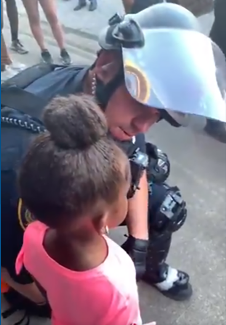 Nghe tiếng khóc của trẻ thơ, một viên cảnh sát người da trắng đứng gần đó quỳ xuống bên cạnh cô bé, kéo shield bảo vệ khuôn mặt lên, nhìn vào đôi mắt tròn ngây thơ, hỏi: