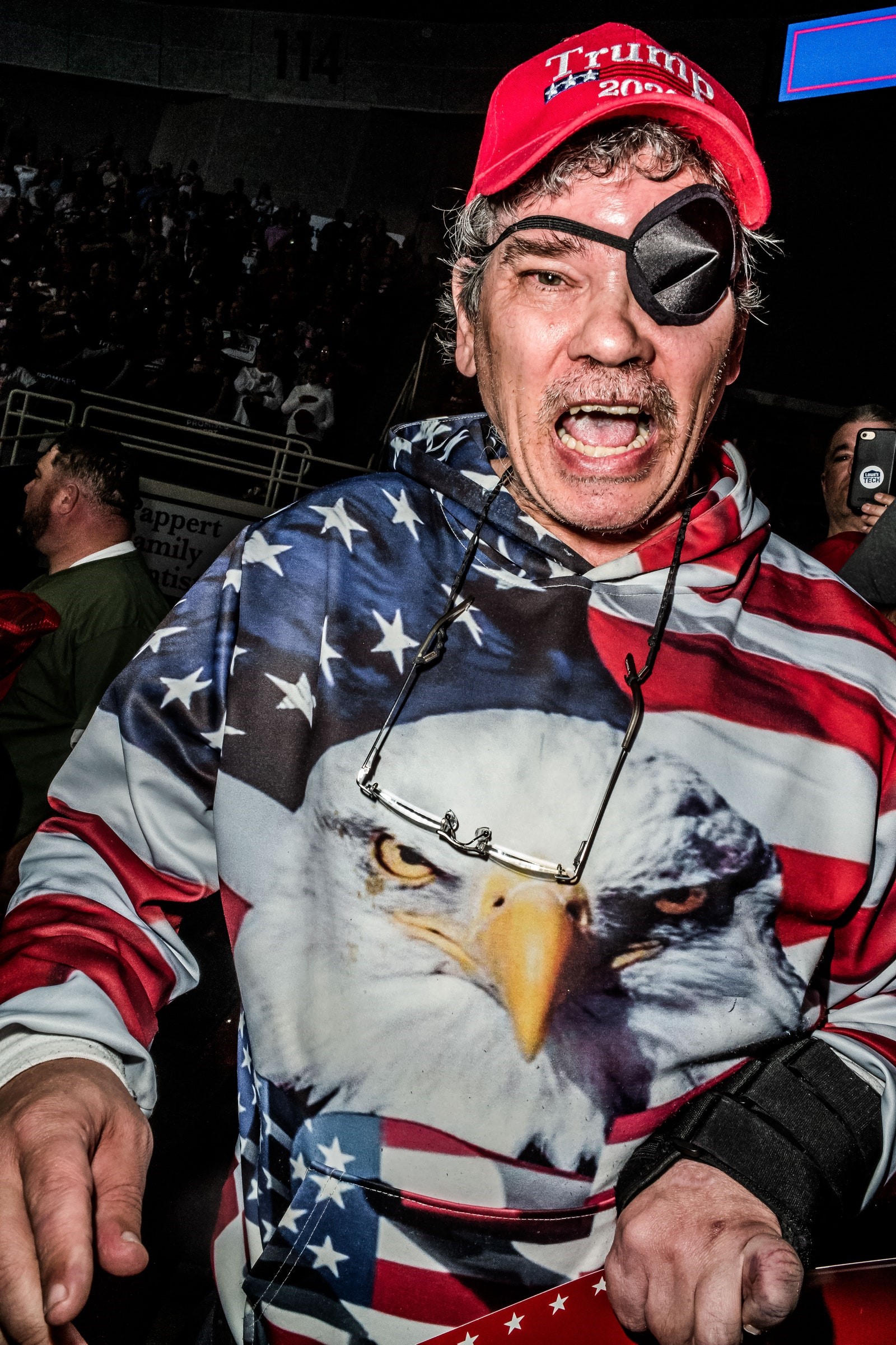 Bên trong địa điểm tập họp, ngay trước diễn đài, phần lớn đều là đàn ông. Họ thà phải đứng ở đây từ nhiều tiếng đồng hồ trước – không ai được phép ngồi – còn hơn là xếp hàng bên ngoài. Tôi khơi mào cuộc chuyện trò với một cặp đứng tuổi. Họ có mặt ở vị trí đầu hàng từ lúc trời chưa sáng. Phần thưởng cho sự tận tụy này là họ được tặng mỗi người một chiếc áo thun đen dài tay có in trên đó hàng chữ màu trắng, TRUMP’S TWEETS MATTER. Người chồng tự giới thiệu họ là những nhà truyền giáo. Ông ta là mục sư Sean Jones. Ông đội mũ MAGA và để râu dài giống như các nhân vật trong kinh Cựu ước. Vẻ mặt ông trông phong trần, thận trọng, và khôn ngoan. Kẹp giữa hai chân ông là một chiếc nón màu đen, có kẻ hàng chữ GOD WINS, lấy ý từ một bài viết trên QAnon rất có ảnh hưởng [QAnon là một nhóm người có tư tưởng hữu khuynh cực đoan, tin rằng hiện đang có một nhà nước ngầm – deep state –mà mục đích của nó là phá hoại và tìm mọi cách lật đổ chính quyền Trump – người dịch]. Áo và mũ của mục sư Sean là món quà tặng từ một vị mục sư bạn, ông này cũng như Sean, có mặt trong hầu khắp các buổi tập họp tranh cử của Trump. Về phần mình, quà tặng của mục sư Sean gởi đến các tín đồ Trump đồng đạo là quyển Tân Ước nhỏ có in kèm theo Hiến pháp Hoa Kỳ, một văn kiện mà Sean tin rằng “mang hơi thở của Chúa”. Ông cho biết đã cho phổ biến cả ngàn quyển thánh kinh như vậy.