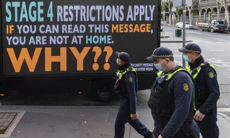 Ở Melbourne, Victoria, Úc, nếu vi phạm lệnh “cấm túc” tại gia, đi ngoài đường không có lý do chính đáng (lý do y tế), sẽ bị phạt 5 ngàn Úc kim (khoảng 3,559 Mỹ kim) cho lần đầu tiên. Vi phạm lần thứ hai, tiền phạt lên đến 20 ngàn Úc kim( tương đương 14,250 Mỹ kim)