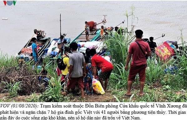 Ngày 31/7, Tổ công tác của Trạm kiểm soát thuộc Đồn Biên phòng Cửa khẩu quốc tế Vĩnh Xương đã phát hiện và ngăn chặn 7 hộ gia đình với 41 người, trong đó có 20 người lớn và 21 trẻ em nhập cảnh trái phép vào Việt Nam bằng phương tiện thủy; 7 hộ gia đình này là người gốc Việt (tnt in đậm) đã sang Campuchia sinh sống nhiều năm tại tỉnh Siem Reap và tỉnh Pur Sát. Thời gian gần đây do cuộc sống gặp khó khăn, nên số hộ dân này đã trốn về Việt Nam.