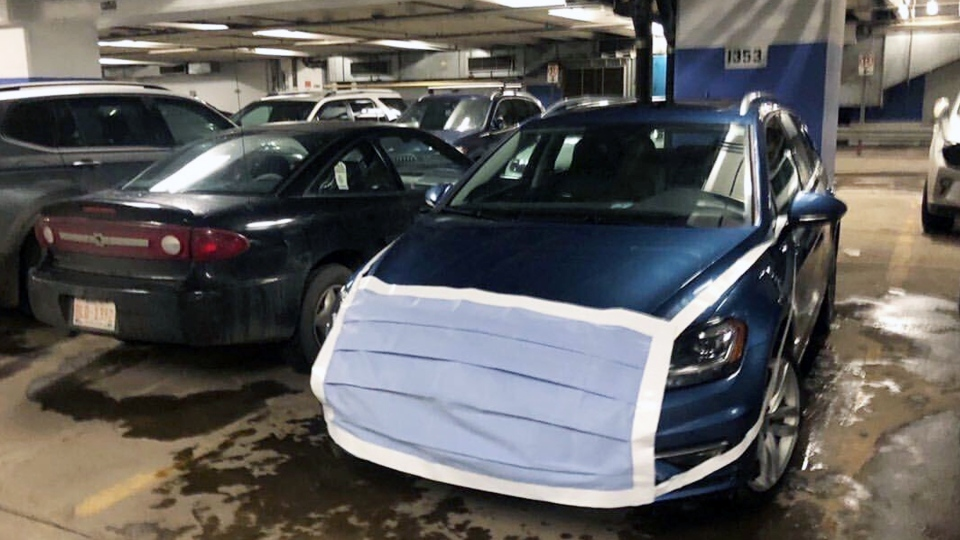 Bác sĩ Brian Stonehocker ở bệnh viện của trường Đại học Alberta ở Edmonton, Canada đã nhắc mọi người đeo khẩu trang bằng cách làm bịt trước đầu xe của ông một miếng vải lớn có màu sắc và hình dáng giống hệt một cái khẩu trang y tế.