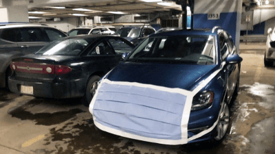 Chiếc xe Volkswagen Passat năm 2019 chạy trên đường phố Edmonton với chiếc khẩu trang bằng vải xanh có băng keo dán màu trắng tựa như dây đeo, đính lên đèn xe., voi kính chiếu hậu ở hai bên của xe trông giống như hai lỗ tai của con người. nhắc mọi người nhớ đến tầm quan trọng của việc đeo face mask trong thời đại dịch.