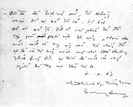 “Đời tôi để lịch sử xử, tôi không chịu để ai xử cả. Sự bắt bớ và xử tội tất cả các phần tử đối lập quốc gia là một tội nặng sẽ làm cho nước mất về tay cộng sản. Tôi chống đối sự đó và tự huỷ mình cũng như Hoà Thượng Thích Quảng Đức tự thiêu để cảnh cáo những người chà đạp mọi tự do.”
